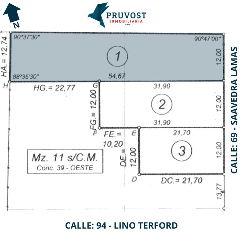 Dimensiones del terreno 12,00 x 54,67 – 674,39 m2 totales.